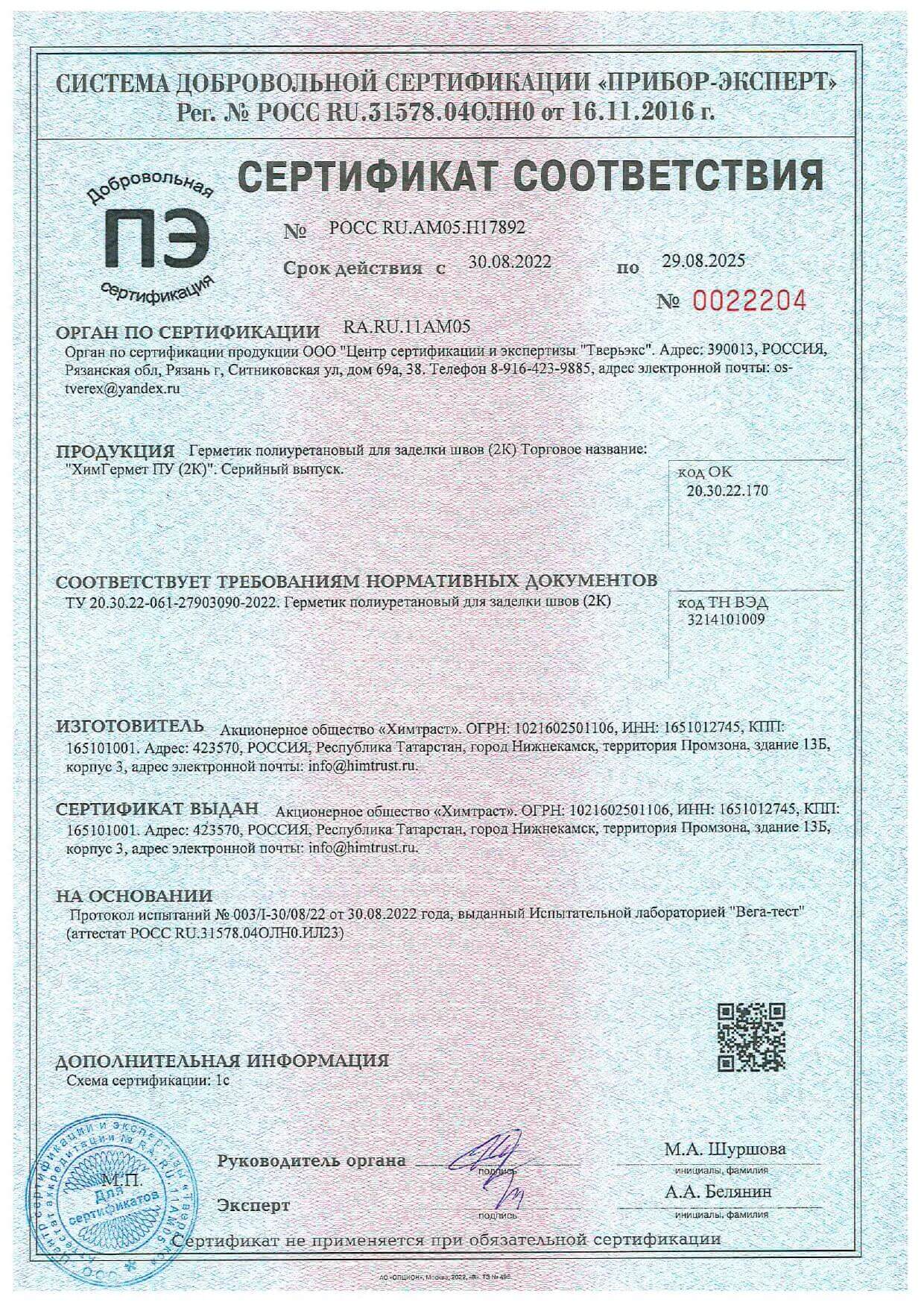Сертификат соответствия на полиуретановый герметик