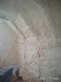 Нанести грунтовочный слой ППУ 2-3 мм, оставить на 5 часов, затем нанести слой ППУ за один проход толщиной не менее 100 мм